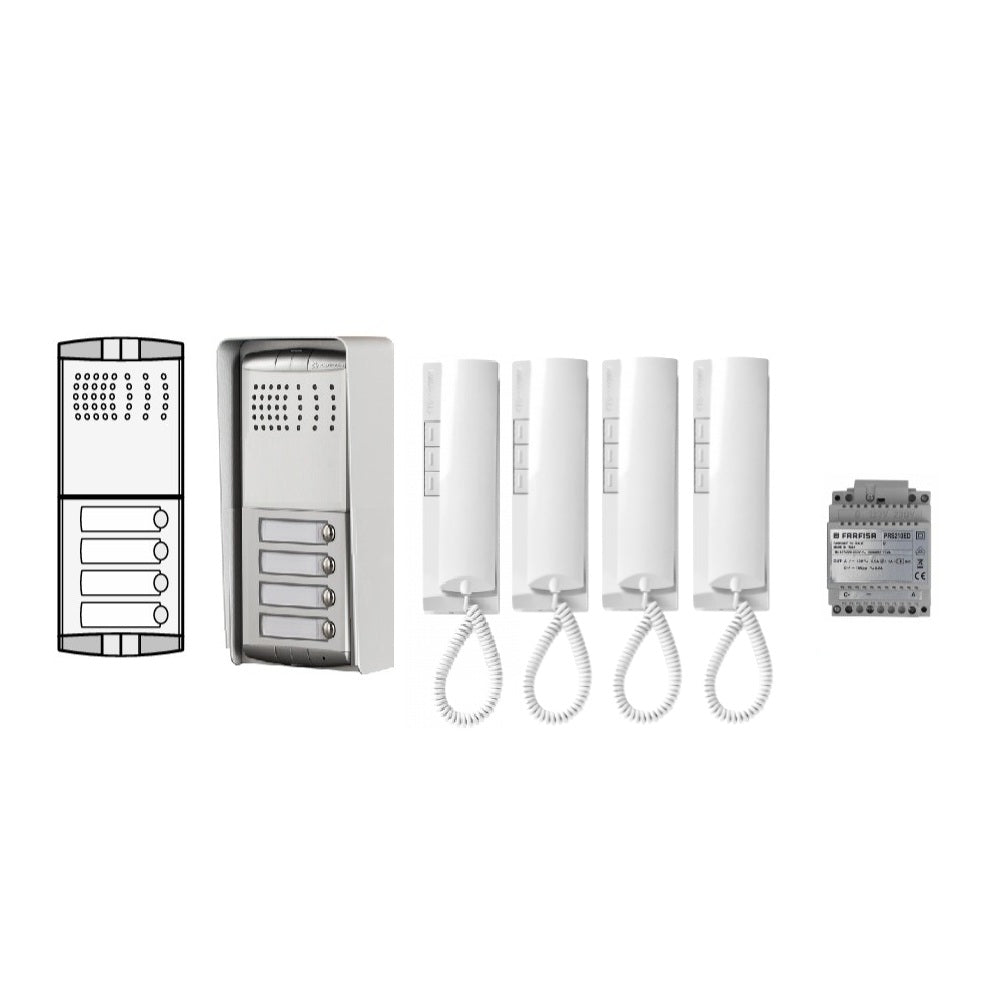 Outlet-tarjous! Täydellinen Farfisa ovipuhelinpaketti neljälle asunnolle/toimistolle. Luotettava 1+1-johdin tekniikka tekee asennuksesta helpon ja kustannustehokkaan.