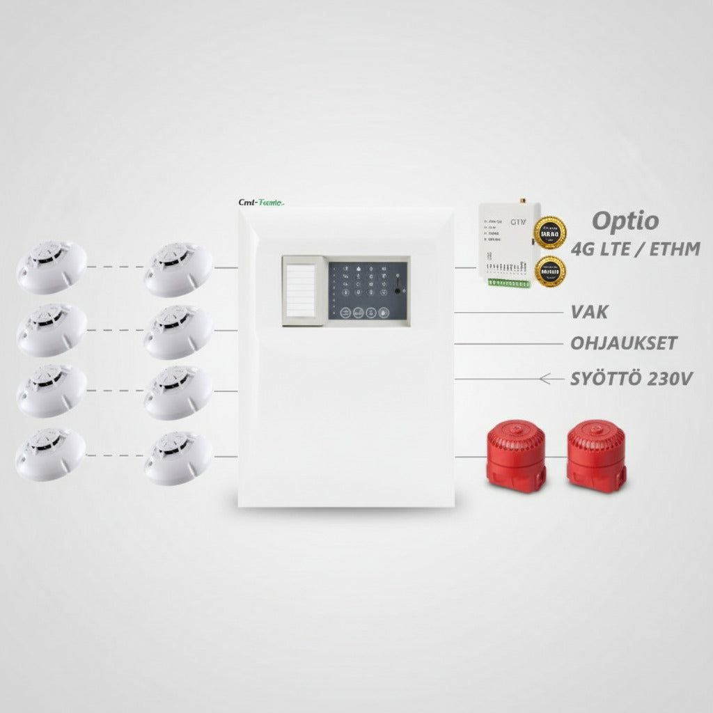 - Käyttöliittymä: LED-valot ja sisäänrakennettu summeri ilmoittavat eri tiloista, kuten palo- ja vikatilanteista