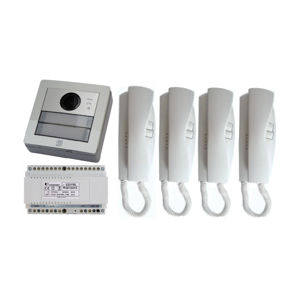 Outlet-tarjous! Täydellinen Farfisa DUO ovipuhelinpaketti neljälle asunnolle. Luotettava 2-johdin tekniikka tekee asennuksesta helpon ja kustannustehokkaan.